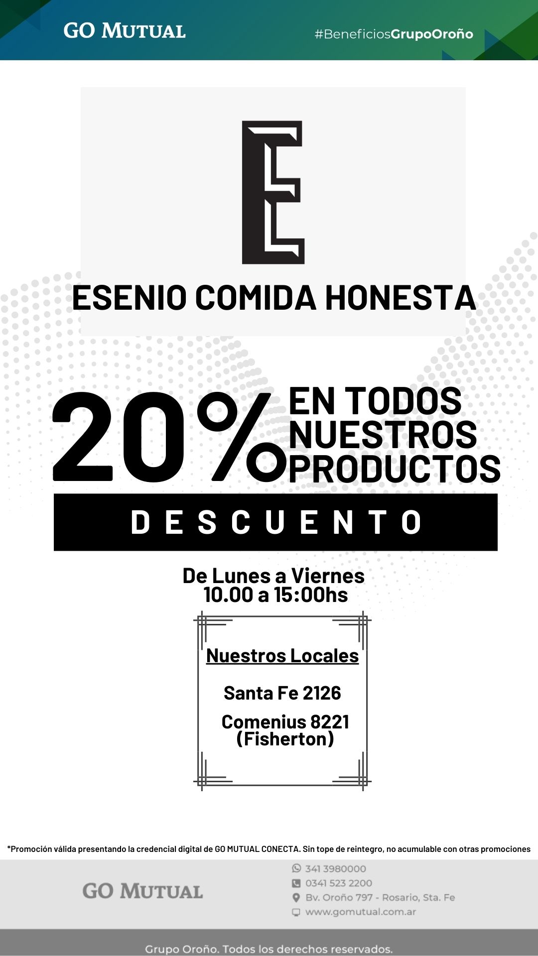 Exhibiendo tu credencial de asociado a Grupo Oroño Mutual (está disponible en tu aplicación GO MUTUAL CONECTA) dispones de un 20% (veinte por ciento) de descuento en cualquier consumo que realices en ESENIO: